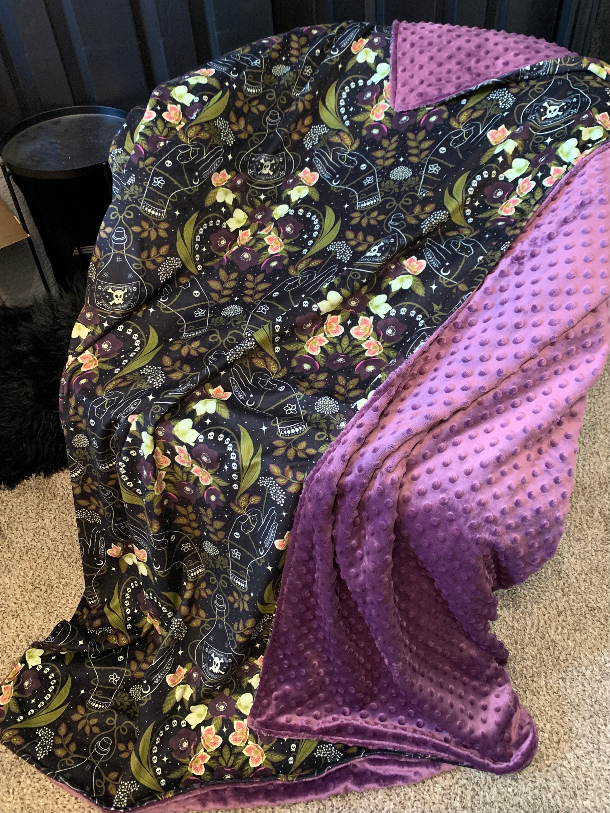 Get ready to experience pure coziness and magic with our Custom Grownup Blankies from the Dark Collection. Each throw blanket is adorned with whimsical witchy cottage prints, featuring things like mushrooms, stars, skulls, moths, candles, ravens, spiders, bats, cats, poisons, and books - making it perfect for snuggling up on a chilly night. Say hello to your new favorite way to stay warm and stylish!