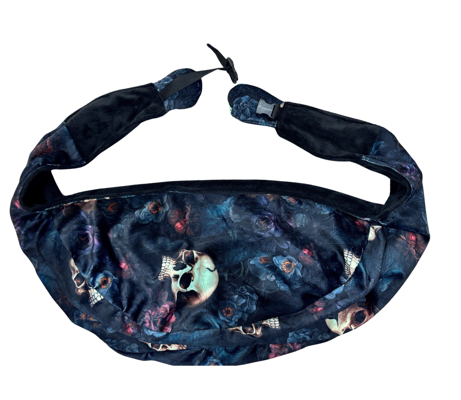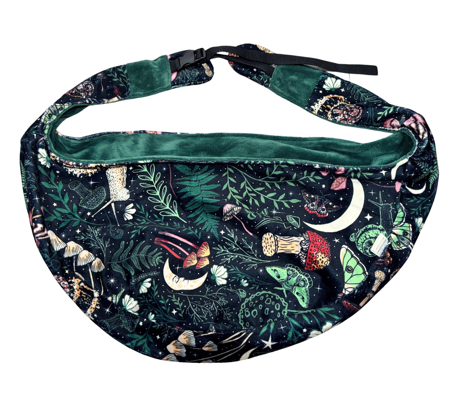 Machine washable on low temps, made of polyester minky fleece inner and outer, polyester nylon web strap, and pastic clips.